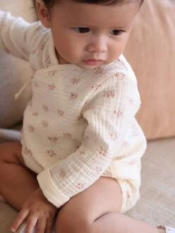 De délicats bouquets sur un tissu en gaze de coton, cet essentiel du trousseau de maternité est plus raffiné que le traditionnel body et se laisse entrevoir sous un gilet. Avec son ouverture devant, il est parfaitement adapté aux nouveau-nés.