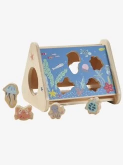 Une jolie boîte à formes triangulaire dans laquelle les enfants devront encastrer les animaux de 3 univers différents : la banquise, la forêt et la mer !