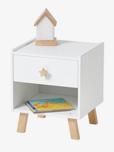 Un chevet tout en douceur et en poésie qui se place à côté du lit pour accueillir une lampe, une veilleuse et accueillir les livres. Il dispose d’un tiroir et d’une niche de rangement.