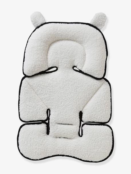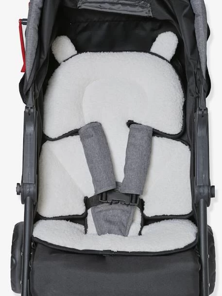 Coussin réducteur pour poussette bi-matière avec une face en teddy polyester et une face polyester. Garnissage polyester.