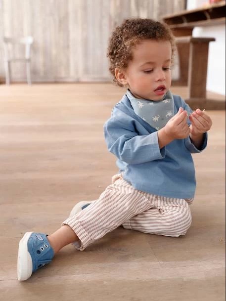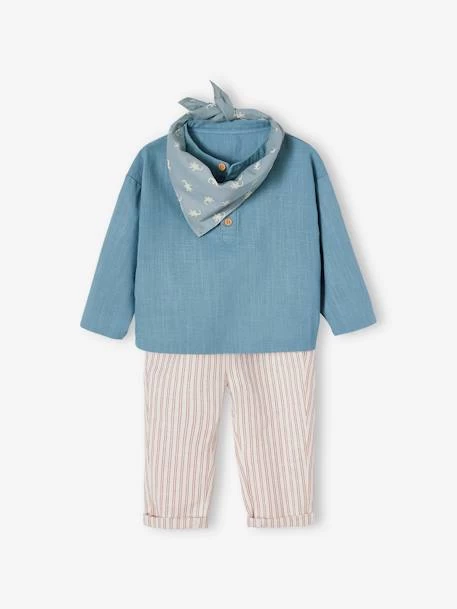 Ensemble 3 pièces bébé : chemise 100% coton, pantalon 57% Lyocell 22 % Coton, 21% lin, bandana 100% coton.