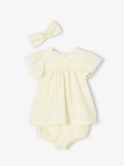 Ensemble 3 pièces Bébé : robe + bloomer + bandeau 89% coton, 11% lin.