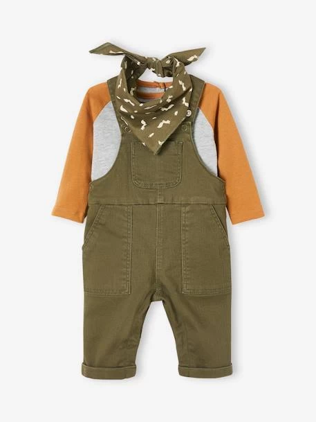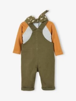Ensemble bébé salopette 83% coton, 15% lyocell, 2% élasthanne, T-shirt 93% coton, 7% viscose et bandana 100% coton.