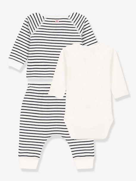 - Ensemble trois pièces en côte, la matière emblématique de Petit Bateau. Composé d’un cache-coeur, d’un pantalon et d’un body.