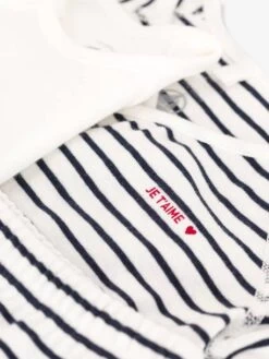 - Cache-cœur en rayure marinière avec sérigraphie « Je t’aime » sur la poitrine.