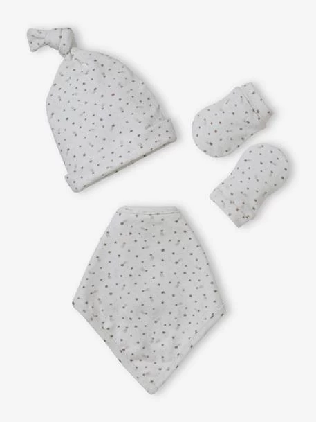 Ensemble bonnet + moufles + foulard + sac bébé fille en maille imprimée 95% coton, 5% élasthanne.