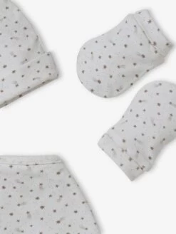 On adore le délicat imprimé étoilé de cet ensemble 4 pièces ! Ce bonnet noué, ces petites moufles et ce foulard sont accompagnés d’un joli petit sac assorti, pour en faire un joli cadeau de naissance !