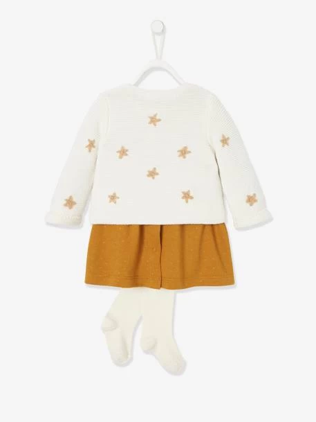 Ensemble 3 pièces bébé. Cardigan et robe 100% coton. Collant 71% coton, 27% polyester, 2% élasthanne.