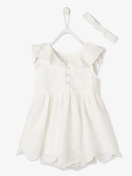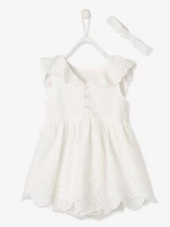 Avec sa broderie anglaise, ses larges volants et son volume dansant, cette robe illuminera les cérémonies et jours de fête. Un bel ensemble robe, bloomer et bandeau assorti, pour des bébés élégants et tellement craquants !