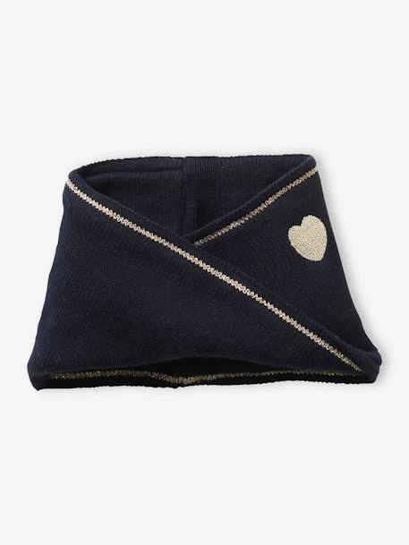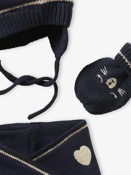 Ensemble bonnet + snood + moufles bébé fille en maille 59% coton, 39% acrylique, 1% polyester, 1% fibres métallisées, doublure 100% polyester.