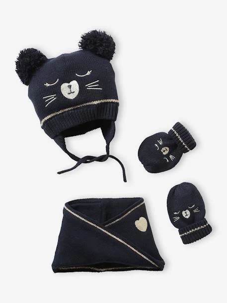 Cet ensemble bonnet, tour de cou et moufles est animé d’un adorable petit chat scintillant ! Si mignon, ce petit chat à croquer ne quittera pas votre bébé de l’hiver…