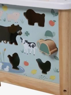 Un cube d’activités en bois taille XL qui ne manque pas d’idées pour éveiller et émerveiller bébé ! 5 faces plus intrigantes les unes que les autres, avec sur le haut du cube, un boulier et ses 2 circuits de perles, qui peut se retourner pour fermer la boite. Sur les 4 faces : une face engrenages, une face animaux à encastrer, une face « musique » avec un bouton à tirer et une roulette avec grelots à l’intérieur, et une face avec des palets à déplacer ! Ce grand cube d’activités promet de jolies découvertes à votre bébé !