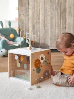 Un joli cube d’activité doté de faces en plexiglas qui offrent de jolies surprises ! Grâce à ce cube, l’enfant pourra faire de multiples découvertes : faire glisser les billes sur le boulier, actionner les engrenages, faire dévaler les palets sur le toboggan… et bien d’autres activités pour stimuler ses sens !