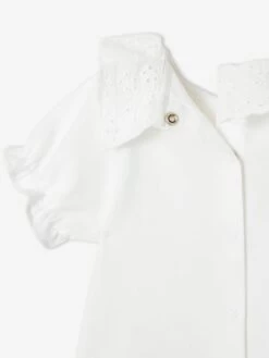 - Un T-shirt uni avec un col en broderie anglaise et manches ballon élastiquées