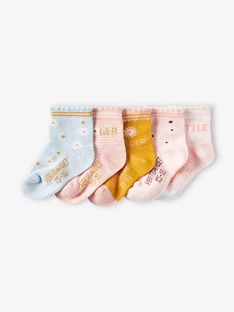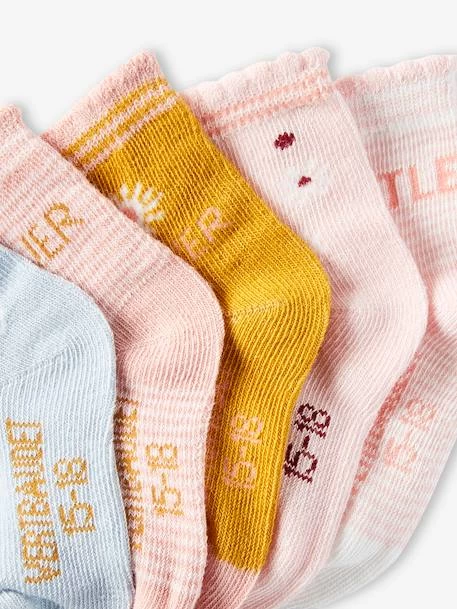 Lot de 5 paires de chaussettes bébé fille 70% coton, 29% polyamide, 1% élasthanne, sauf version rayée 74% coton, 25% polyamide, 1% élasthanne.