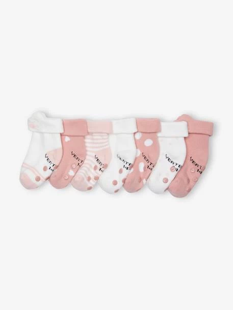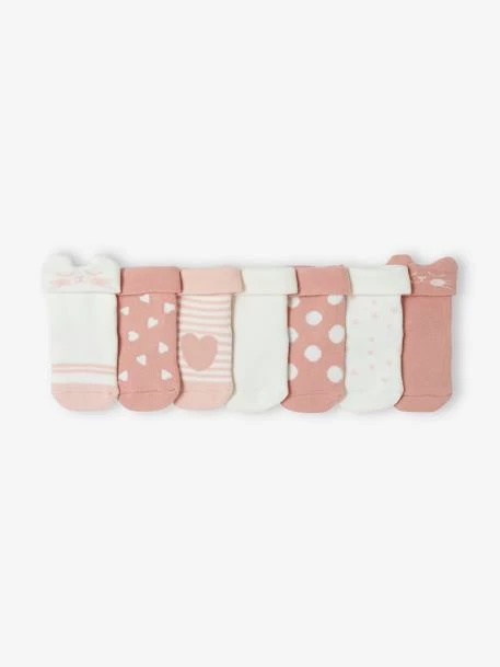 Lot de 7 paires de chaussettes bébé fille 77% coton, 14% polyamide, 7% polyester, 2% élasthanne, sauf paires unies et « chats » 83% coton, 13% polyamide, 2% polyester, 2% élasthanne.