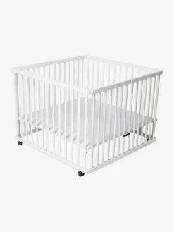 Parc pliant VERTBAUDET en bois de hêtre. Fond de parc en panneaux aglomérés recouverts de mousse et de PVC. Charnières en plastique.