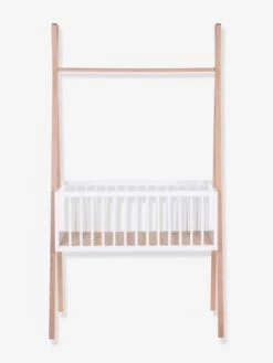 Parc pliant VERTBAUDET en bois de hêtre. Fond de parc en panneaux aglomérés recouverts de mousse et de PVC. Charnières en plastique.
