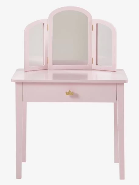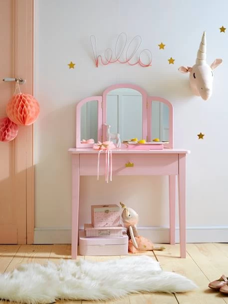 Pour votre petite princesse en devenir, voici la coiffeuse rêvée de toutes les petites filles ! Toute rose, avec un miroir triptyque pour se pomponner, un grand tiroir pour garder les secrets et une poignée en forme de couronne pailletée… On en connait une qui va faire des jalouses !