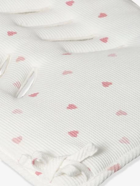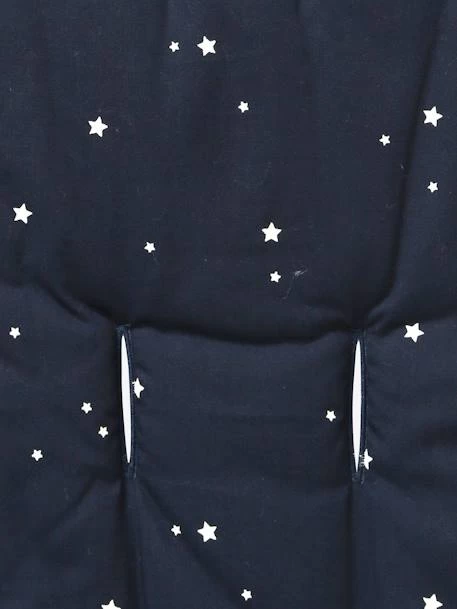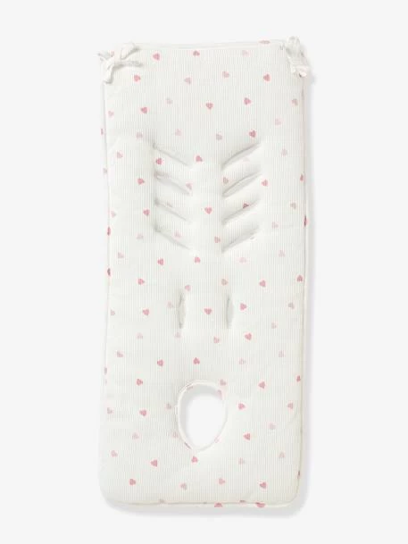 Protection réversible pour assise de poussette – version marine/étoiles en toile pur coton, toucher doux. Version rose/coeurs en coton nid d’abeille.