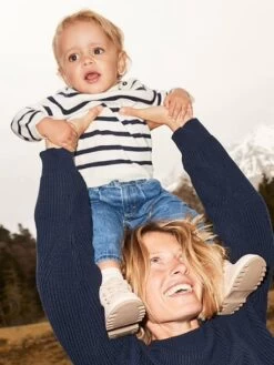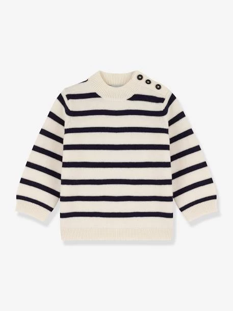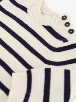 Un pull bébé à rayures marinières iconiques en tricot de laine et coton. Un mélange doux et chaud pour l’hiver.