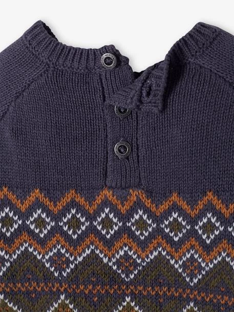 Pull jacquard bébé 100% coton (gris chiné), 98% coton, 2% viscose (camel).