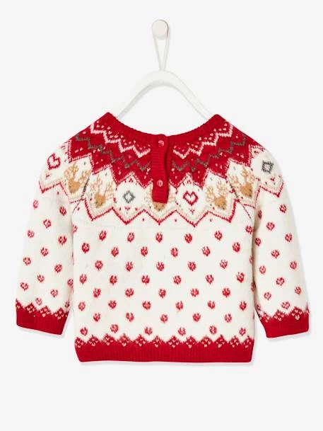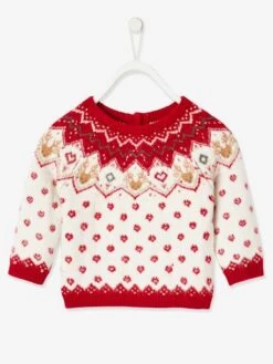 Pull jacquard de Noël bébé 69% acrylique, 27% polyester, 3% élasthanne, 1% fibre métallisée.