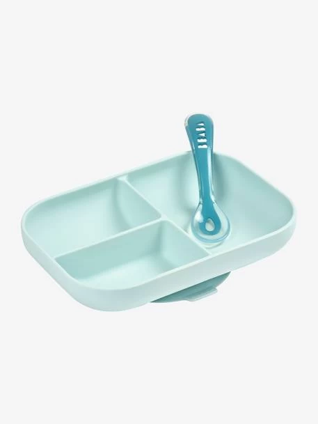 Formes ergonomiques et matière silicone douce incassable pour faciliter l’apprentissage des repas, en toute sérénité ! Composé d’une assiette repas 3 compartiments et d’une cuillère 2ème âge, le set vaisselle 2 pièces en silicone de Béaba va permettre à votre enfant d’apprendre à manger seul et de découvrir les saveurs et textures des différents aliments. Matière silicone incassable, ventouse pour adhérer à la table… Béaba a pensé à tout pour éviter les petits accidents et assurer la sécurité de votre enfant ! Le design et les formes des ustensiles ont été étudiés pour aider les enfants dans la prise des aliments. Enfin, pour réchauffer les petits plats, rien de plus simple ; le set vaisselle en silicone passe au micro-ondes ! Alors c’est parti pour de franches parties de régalades !