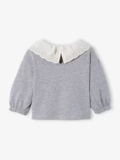 T-shirt bébé en jersey 85% coton, 15% viscose, col en broderie anglaise 100% coton.