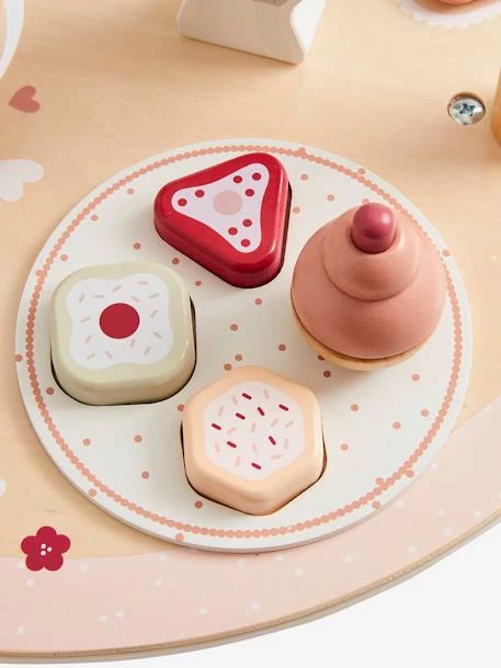 - Une partie puzzle présenté dans une assiette avec 3 formes à encastrer et un cupcake à empiler en deux parties sur une tige