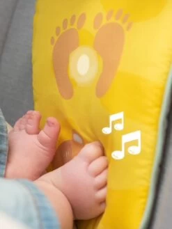 - En bas du centre d’activités est inclus un jouet électronique avec sons et lumières, déclenchés par les coups de pieds de bébé. Cela permet au bébé de comprendre la relation de cause à effet.