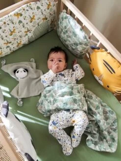 A la fois déco, confortable et anti choc, le tour de lit / tour de parc rassure les enfants en les entourant de douceur et en reproduisant le cocon de la maternité. Bébé pourra s’éveiller en toute sécurité, sans risquer de se cogner contre les barreaux. Les éléments modulables se fixent par nouettes et permettent une bonne circulation de l’air.