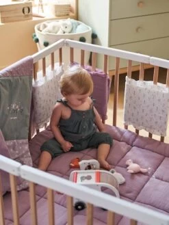 A la fois déco, confortable et anti choc, le tour de lit / tour de parc rassure les enfants en les entourant de douceur et en reproduisant le cocon de la maternité. Bébé pourra s’éveiller en toute sécurité, sans risquer de se cogner contre les barreaux. Les éléments modulables se fixent par scratches et permettent une bonne circulation de l’air.