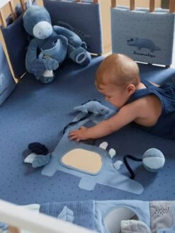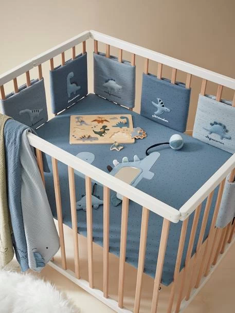 A la fois déco, confortable et anti choc, le tour de lit / tour de parc rassure les enfants en les entourant de douceur et en reproduisant le cocon de la maternité. Bébé pourra s’éveiller en toute sécurité, sans risquer de se cogner contre les barreaux. Les éléments modulables se fixent par scratches et permettent une bonne circulation de l’air. On craque pour la gaze de coton et les différents bleus qui décorent la pièce avec délicatesse.